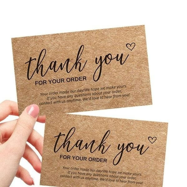 Um jeder Bestellung eine persönliche Note zu verleihen, empfehlen sich Kärtchen mit einer kleinen Nachricht oder einem Gruß an den Kunden. Dabei ist es extrem wichtig, dass Sie Ihre Botschaft mit großer Sorgfalt verfassen, damit sie aussagekräftig ist und das gesamte Auspackerlebnis abrundet. Ein einfaches Dankeschön für den Einkauf auf ihrer Plattform ist in der Regel ausreichend. Für Stammkunden können Sie allerdings jederzeit individuelle Nachrichten verfassen und zusammen mit kleinen Geschenken (wie im nächsten Abschnitt erwähnt) ergänzen. Achten Sie dennoch darauf, dass Sie dem Kunden dabei nicht zu nahe treten, er soll sich schließlich wohl fühlen.
