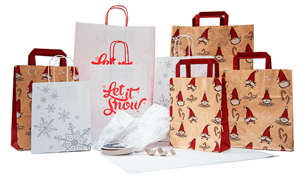 Unser Weihnachtssortiment umfasst Papiertragetaschen, Papiertüten, Seidenpapier und Packpapier. Sie haben die Qual der Wahl.
